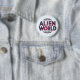 This button features the words "Alien World" in a bold font made up of a mesmerising blend of spacey colours—deep cosmic blues, vibrant purples, and glowing nebula-like accents. Perfect for sci-fi fans, space enthusiasts, or anyone wanting to add a touch of intergalactic flair to their outfit, bag, or collection.
