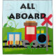 Kids who love trains will love this colourful, fun train theme shower curtain featuring a locomotive and car on a railroad track with black text that reads All Aboard!