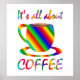 Coffee lovers will enjoy this colourful design with the coffee cup and the words it's all about Coffee.