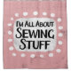 "I'm All About Sewing Stuff" is a cute text design in pink with black text, along with a white accent shape and white textured whimsical dots surrounding it.