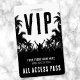 This black and white VIP badge features a bold silhouette design perfect for an outdoor concert or a party with a Coachella vibe. The front shows a crowd of concert-goers with their arms raised, surrounded by palm trees, creating a striking festival atmosphere. "VIP" is displayed at the top in a bold font, with the event name, date, and "All Access Pass" placed neatly at the bottom.