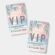 This VIP badge features a dreamy pastel pink and blue sunset setting over the ocean and sandy beach, creating a soft and relaxing coastal vibe. Gentle sunset hues blend across the sky and reflect onto the water, giving the design a warm, inviting feel. Palm tree fronds frame the top of the badge, adding a tropical touch and enhancing the beachside atmosphere.