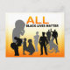 From womb until old age, and in every walk of life, ALL Black Lives Matter. Shown against an orange and yellow gradient background are silhouettes of Black people from various ages and occupations, including a foetus, a policeman, and an elderly woman in a wheelchair. There are also images of mothers with their children, a business man and woman, a policeman, and a protestor with lifted fist, showing a wide range of people who ALL matter.