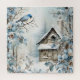 A watercolor image of a beautiful all blue image of a winter scene with a bird, old cabin, snow and blossoms