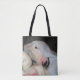 This tote features an English Bull Terrier who has attempted to cover herself up with a blanket.  She almost did it!  This sweet little girl is Mackenzie the English Bull Terrier who we adopted from a rescue several years ago.  She has definitely stolen our hearts with all of the cute things that she does.   In this photo she has tried to cover herself  up with a light blue blanket and is snuggling into a soft white blanket with red flowers on it.   There is never a dull moment with these wonderful dogs affectionately know as "The Clowns of the Dog World".  Please consider adopting your next pet from a rescue or shelter.