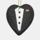 Heart-shaped ceramic ornament with an image of a tuxedo with a black bow tie and a red rose bud boutonnière. See female counterpart ornament "All Dressed Up 1". See the entire Cancan Ornament collection in the PARTY FAVORS section.
