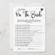 Ideal for bridal showers, couples showers, brunch and bubbly parties, or wedding showers, this game asks guests to carefully observe the bride’s outfit at the beginning of the party. Later, they’ll answer questions like “What colour were her shoes?” or “Was she wearing earrings?” — turning a sweet moment into an unexpected challenge!