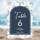 This All I Sea Is Love Dark Blue Seashells Table Number showcases a bold deep blue background filled with playful coastal doodles—seashells, starfish, hearts, sparkles, and waves. At the centre, a solid dark blue arch with a thin white inner outline frames the editable text beautifully. Inside, the phrase “All I Sea Is Love” sits at the top, followed by a customisable line for names, a simple seashell illustration, and the table number. Dramatic, elegant, and entirely editable, it suits nautical weddings, evening ocean themes, and deep-sea–inspired celebrations.