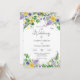 This is a boho rustic wildflower themed wedding invitation. The design features a variety of spring summer wildflowers including yellow daffodils, purple pansies, clovers, lavender, sweetpeas, dandelions, fern and ivy greenery.