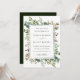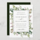 This Christmas wedding invitation features painted watercolor red berries, pine branches, eucalyptus, green leaves with a green rectangle frame. Save paper by including the details and RSVP on the back of the wedding invitation. For more advanced customisation of this design, please click the "Customise Further" link!