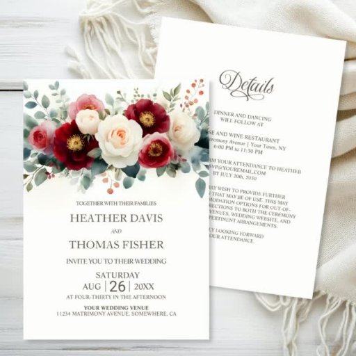Invite your friends and loved ones to celebrate your union with this burgundy and white floral wedding invitation. The customisable text allows you to effortlessly add the bride and groom’s names, wedding date, and the necessary details of your celebration. Designed for the budget-savvy couple, the reception venue location, RSVP response request, accommodation details, and any other information your guests may require can be included on the reverse side of this invitation, saving money on extra stationery. A variety of paper types and corner styles are available for your unique invitations, along with the option to download.