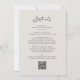 All in One Trendy Modern Black Calligraphy Script Elegant Eggshell Wedding Invitation... Our trendy "front and back" black on eggshell wedding invitation features chic modern calligraphy script combined with serif and sans serif text for a simple classic wedding invitation. The back of the invitation contains all of the details you would typically see on separate cards in the wedding packet. This modern style wedding invitation was designed to be both trendy and budget conscious... not to mention time-saving. On the back there is also a QR code graphic template you can replace by typing in your wedding website URL (or delete if you don't plan to use one... ALSO - don't forget to delete the text that refers to the QR code information). All example text (aside from the graphic calligraphy elements) can be easily revised with your own information on the personalisation template.