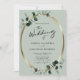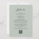 All in One Eucalyptus Modern Calligraphy QR Code Sage Wedding Invitation... Our "front and back" botanical wedding invitation features a faux gold oval frame embellished with emerald-hued eucalyptus leaves on a chic sage background. Modern calligraphy displays text for "the Wedding of", "and" as well as "reception to follow." The light sage back of the card contains all of the details you would typically see on separate cards in the wedding packet. This modern style wedding invitation was designed to be both elegant and budget conscious... not to mention time-saving. On the back there is also a QR code graphic template you can replace with your own code just by typing in your wedding website URL. All example text (aside from the calligraphy graphics) can be easily revised with your own information on the personalisation template.