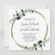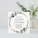 Eucalyptus Gold Metallic All in One White and Sage Square Wedding Invitation... Our "front and back" white and sage botanical wedding invitation features a gold metallic circle shape embellished with emerald-hued eucalyptus leaves creating a natural looking border for the invitation text within. The back of the card contains all of the details you would typically see on separate cards in the wedding packet. This modern style wedding invitation was designed to be both elegant and budget conscious... not to mention time-saving. On the back there is also a QR code graphic template you can replace with your own code (or delete if you don't plan to use one). All example text can be easily revised with your own information on the personalisation template.