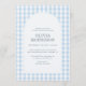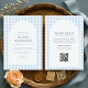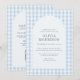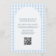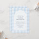All in one blue gingham baby shower invitation for celebrating a baby boy. Designed with a classic, sweet style and a convenient tear off RSVP postcard for easy replies. Ideal for traditional showers, backyard gatherings, and family celebrations. Editable text. Print ready layout.