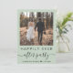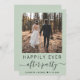 Elegant sage green elopement or private wedding announcement and all-in-one wedding reception invitation. The front features your photo, "Happily Ever After Party" in a blend of simple typography and a chic script with swashes, and your names and wedding or reception date joined together by a heart. On the back, personalise your details, input your wedding website address to create a QR code for guests to scan to see your wedding photos, all of the details and to RSVP online, and add your names in a signature-like script.