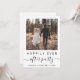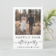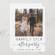 Elegant elopement or smaller wedding announcement and all-in-one wedding reception invitation. The front features your photo, "Happily Ever After Party" in simple typography and a chic script with swashes and your first names and wedding or reception date joined together by a heart. On the back, personalise your details, input your wedding website address to create a QR code for guests to scan to see your wedding photos, all of the details and to RSVP online, and add your names in a signature-like script.