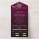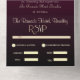 invitación con elegante textura de colour cereza degradado y foto de pareja y palomas con anillos y brillo con el texto dorado para una simple boda.