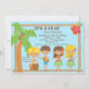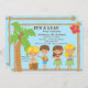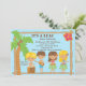 Start your celebration off right with this adorable Luau invitation. Whether it's a backyard barbecue or a kids birthday party this is the perfect invite for you! It has a teak wood frame with a palm tree in the left corner. There's 4 hawaiian kids along the bottom. 2 boys and 2 girl. One's playing the bongos , another the ukulele . The girls are wearing grass skirts and has a flower in their beautiful long hair. In the top right corner there is a red hibiscus flower. Check out the many other designs and products in this line. ©JW Illustrations