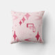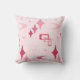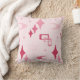 This throw pillow features a mid century modern pattern of diamonds, boomerangs, atomic symbol in shades of pink for a fun, retro 1950s vibe.