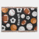 A black throw blanket featuring an assortment of sports related balls including football, baseball, basketball, volleyball, and soccer ball. Centred in the middle is a spot for your gift recipient's / future All-Star's name.