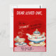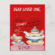 This postcard features a vintage valentine image, with a teapot and a cup of tea. The text reads, I'm all steamed up over you valentine-you suit me to a tea!" The background colour and "Dear Loved One" text can be customised as desired.