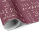 Merry everything! Share ALL the holiday wishes with this unique wrapping paper featuring your family name in a repeating pattern of Merry Christmas, Tis the Season, Happy Holidays, and Peace on Earth on a rich burgundy plum background.