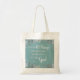 Tote bag with distressed white typography on textured aqua background surrounded by watercolor flowers, with well known verse from Romans 8:28, “… All things work together for good for those who love God…”