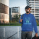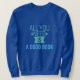 Men's blue Sweatshirt with a humourous phrase read: "All you need is a good book." Alma Wad's bold, skyblue text design. Now, you can change the colours. Excellent for book lovers, librarians, and educators