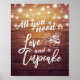 All You Need is Love and a Cupcake Wedding Party Decor Sign Poster Templates - Lovely Couple Cupcakes and String Lights on Rustic Wood Background.