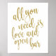 An elegant cutting edge wedding sign, features the text "All you need is love and open bar" in a extroverted script font, the glitter texture adds a festive and glamourous touch. The background colour can personalised according to your needs and preferences, please contact me if you have any special request.