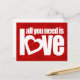 "all you need is love" typographical design on red damask with hearts background. Designed by Sarah Trett.