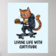 This poster of a cartoon alley cat exudes a sense of mischief. He is skilfully balancing on a skateboard. In one paw, the cat confidently holds a delicious burger and in the other paw he clutches a small paper bag filled with golden chips. Below the design, the bold text reads, "Living Life With Cattitude," that complements the theme.