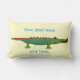 Customisable 13” x 21” light yellow lumbar throw pillow with an image of a green alligator with blue polka dots and red polka dot scales. Light yellow back. See the entire Kidz Korner Pillow collection under the HOME category in the KIDZ KORNER section.