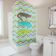 Shower curtain with a chevron striped background of green, white, blue, and brown with three alligators, a brown polka dotted gator, turquoise blue polka dotted gator, and a green chevron stripe gator!