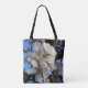 Photograph of fresh almond blossoms in the cool of a spring morning. Since these totes are not machine washable, it's a good idea to spray them with a water repellent. That way you can wipe them off and stay looking new.