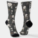 These fun feminine gothic socks are hand-drawn in black ink by Nathalie Portet, featuring whimsical skulls and blush pink and cream roses and spiderwebs. Almost black background.
