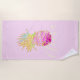 NewParkLane - Fun, Tropical Beach Towel, with a Hawaiian pineapple in colourful bold coloured watercolors and faux gold glitter, and 'Aloha' written in elegant script typography.