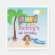 Tropical beach Luau birthday personalised paper napkins, with cute hula girl, palm tree and beach scene, with easy to customise text. Complete your summer theme party with this customised sign, great for kids or adults.