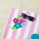 Pink, teal, aqua, fuchsia, lime green and rose colorway. Cartoon flowers help send the message that aloha means hello! This design plays on top of a awing beach stripe and is available in several colour ways.