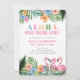 Aloha Onederland Summer Tropical Girl 1st Birthday Invitation features a vibrant tropical design with lush green leaves, pink flamingos, and colourful flowers on a white background. The playful title "ALOHA ONE-DERLAND!" sets the fun tone, with space for a personalised name and party details.