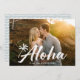 Modern, tropical holiday card displaying your full-bleed horizontal photo on the front with "Aloha" in a white hand-lettered script complimented by a hand-drawn palm tree. Personalise the front of the Aloha holiday card by adding your name. The card reverses to feature an additional photo and your custom message with white ocean waves against a light grey blue background. Designed to coordinate with our Aloha Palm Tree holiday collection.