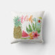 Tropical, beach luau theme throw pillow featuring a colourful "Aloha" greeting, watercolor fruit (pineapple, watermelon, orange), an icy cocktail glass with festive drink umbrella and a pink hibiscus flower and palm leaf.