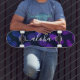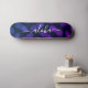 “Aloha”. Bring a bit of the Hawaiian islands to your city streets whenever you use this brightly colored, chic, striking, stylish, modern skateboard sporting crisp, white handwritten script typography over a distressed graphic, purple blue ombre pineapple pattern over a black background. Makes a fun and stylish statement every time you surf the pavement. Makes a great gift for a friend, or for yourself if you can’t bear to gift it away!