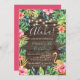 Aloha tropical Hawaiian bridal shower invitation: hand-painted watercolor floral border with a gold flamingo in the lower corner, wooden background, and fairy lights. The reverse side features a solid coral background to coordinate with the script font and floral accents. The perfect choice for a summer bridal shower.