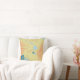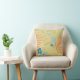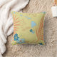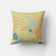 Tropical pillow with yellow background, orange fern leaves, blue Hawaiian islands, starfish, flowers and the word "aloha."