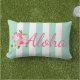Tropical pillow design features a pattern of white vertical cabana stripes with seafoam green / aqua background colour (can be customised) and hot pink "Aloha" in script with hibiscus flowers.