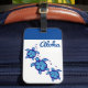 Custom luggage tag is shown in a cute tropical blue turtles print design.