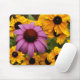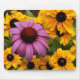 A Purple Coneflower stands out of a patch of Black-Eyed Susans.
