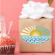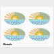 Oval sticker featuring design with different shades of blue waves with bright sun on white and blue horizon.